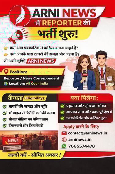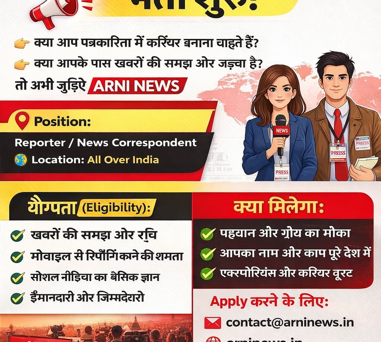 Kickstart your journalism career with Arni News. We're hiring reporters all over India. Send us a mail or WhatsApp to begin.